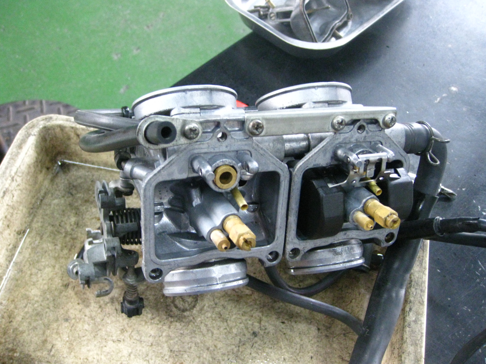今回のポイントはキャブレターのオーバーフローです。 油面調整&フロートバルブ交換してもドレンホースからポタっと落ちます。