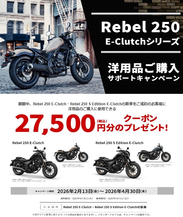 ・スタンダードモデル(Rebel 250)はキャンペーン対象外です。